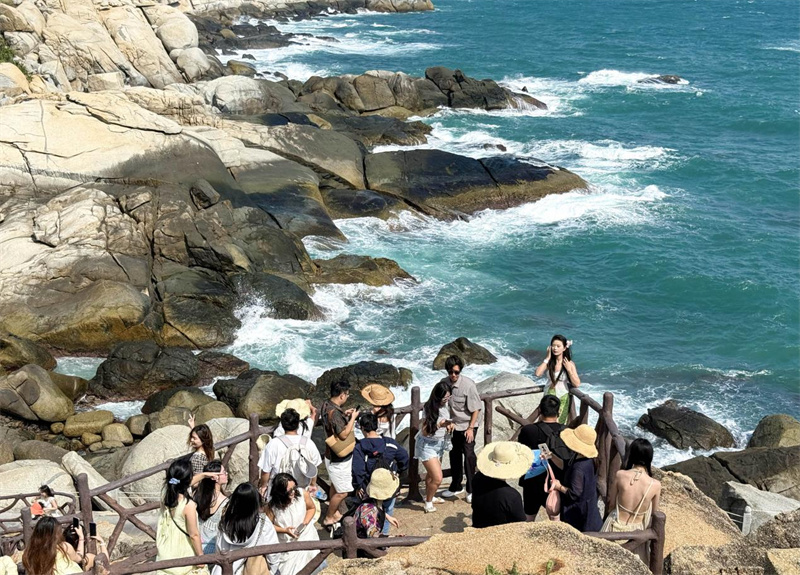 游客在三亚蜈支洲岛风景区欣赏热带海滨风光。王程龙 摄