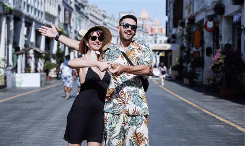 外国游客在海口骑楼老街打卡。海南省旅游和文化广电体育厅供图