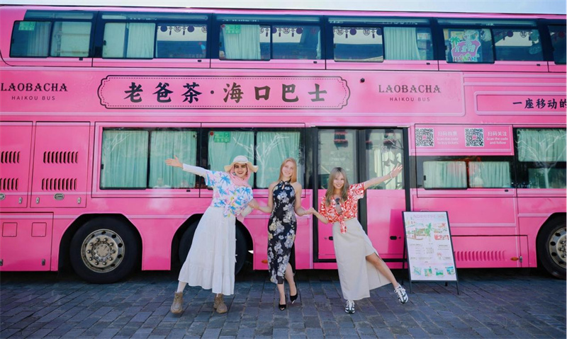 外国游客打卡老爸茶海口巴士。海南省旅游和文化广电体育厅供图