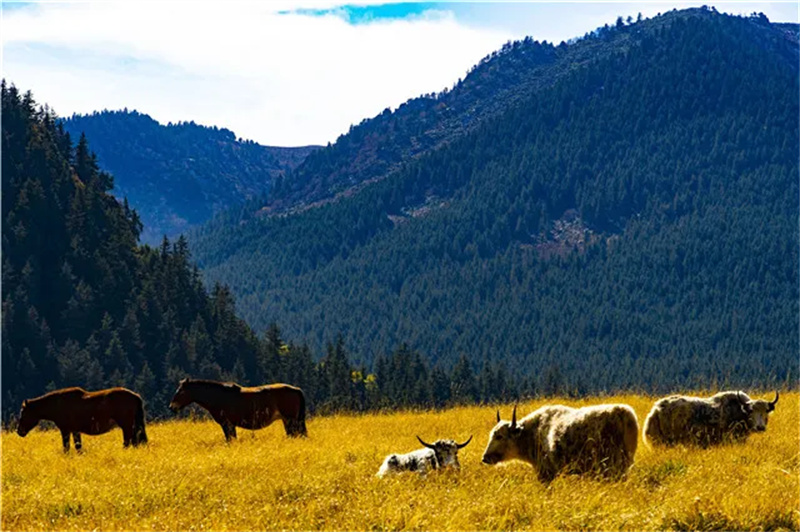 而冰沟河景区,更是一幅层林尽染的山水画卷。高山草甸、原始森林、雪山冰川等多种自然景观在秋季的渲染下变得格外迷人。原本翠绿的马兰花草原在秋天变成了金黄色,微风拂过,金色的草浪此起彼伏。远处,阿尼岗噶尔雪山在秋日阳光的照耀下,闪耀着圣洁的光芒,与山间的红叶、绿树相互映衬,构成了一幅绝美的秋日风光图。尼美拉大峡谷中,峡谷幽深,溪水潺潺,偶尔还能看到瀑布飞泻而下,水花四溅,在秋日的阳光下形成一道道绚丽的彩虹。