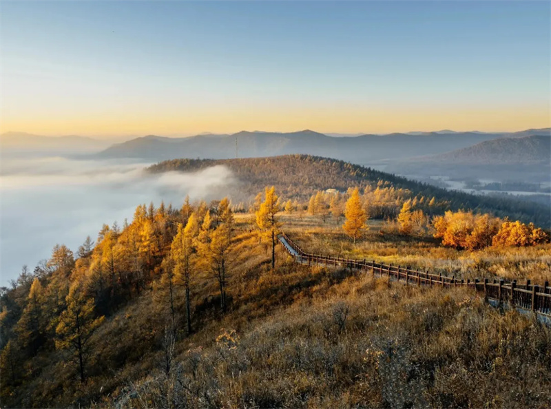 因纬度较高,阿尔山是中国最早入秋之地。9月中旬起,这里的色彩便按下“渐变键”:山脚落叶松泛黄、山腰枫叶火红、山顶松柏翠绿,三色层层叠加、过渡自然,宛如精心打理的“金渐层”皮毛,既有金黄暖意,又有红绿点缀,满是秋日诗意。