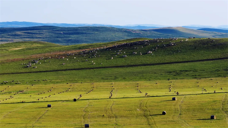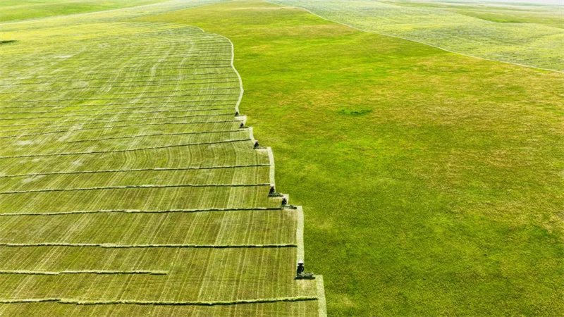 丰收的喜悦,不仅在赛畜会上传递,更在田间地头蔓延。在锡林浩特市毛登牧场生态园区,一年一度的打贮草作业已近尾声。职工们驾驶着各类机械,有条不紊地将牧草打捆、装车,为即将到来的冬季储备充足草料,确保牲畜安全过冬。