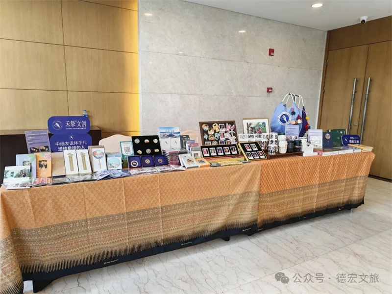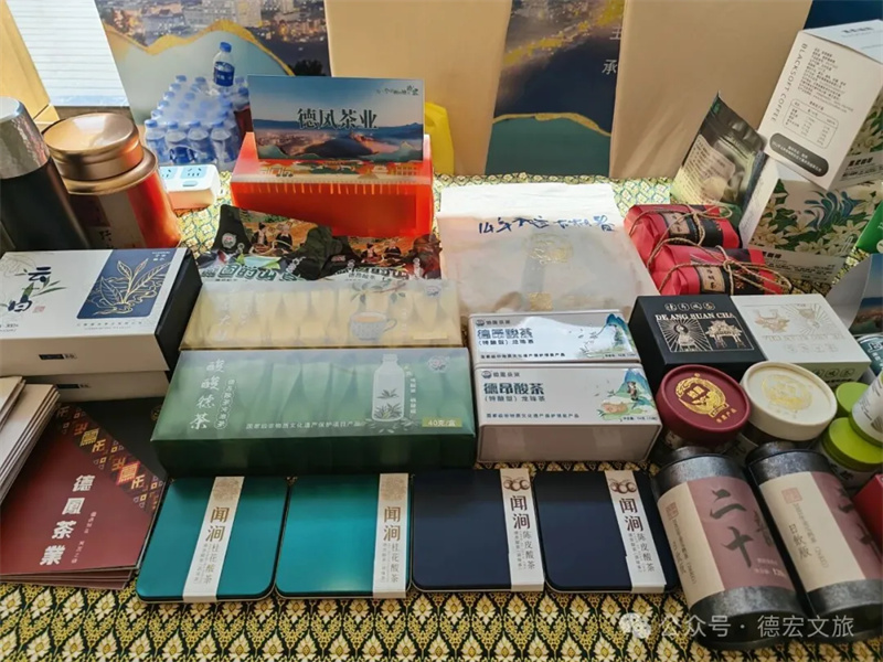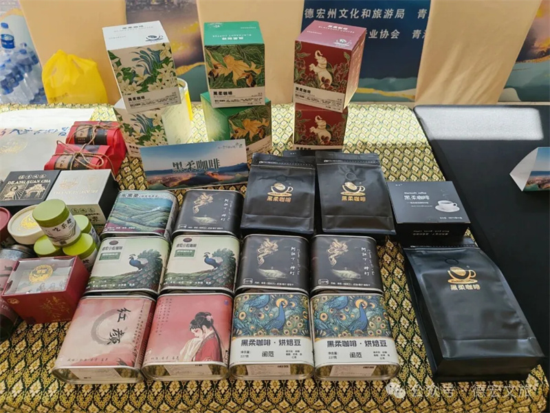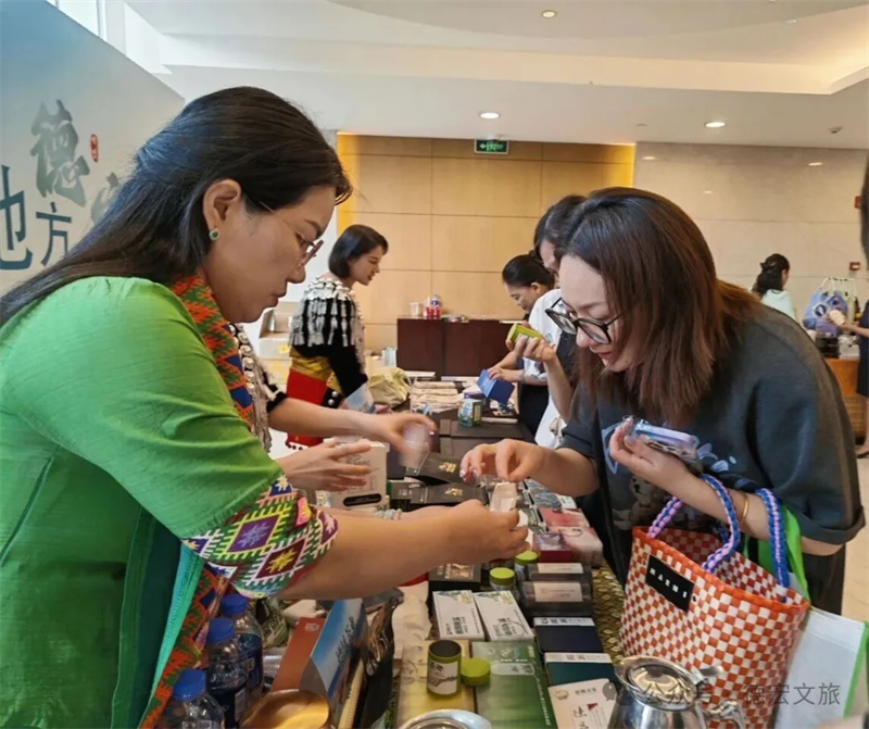 会后,众多嘉宾驻足德宏文创、旅游商品展区。由南禾文化带来的融合民族元素与现代设计的文创产品、德宏本土品牌黑柔咖啡的醇香体验,以及德凤茶业展示的人类非遗项目的子项目——德昂酸茶,成为现场关注的焦点。与会嘉宾纷纷品鉴、交流,对德宏深厚的文化底蕴和独具特色的旅游商品表现出浓厚兴趣,为后续两地文旅企业深入合作打下坚实的基础。