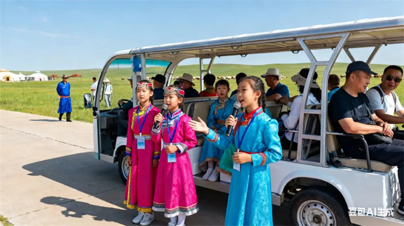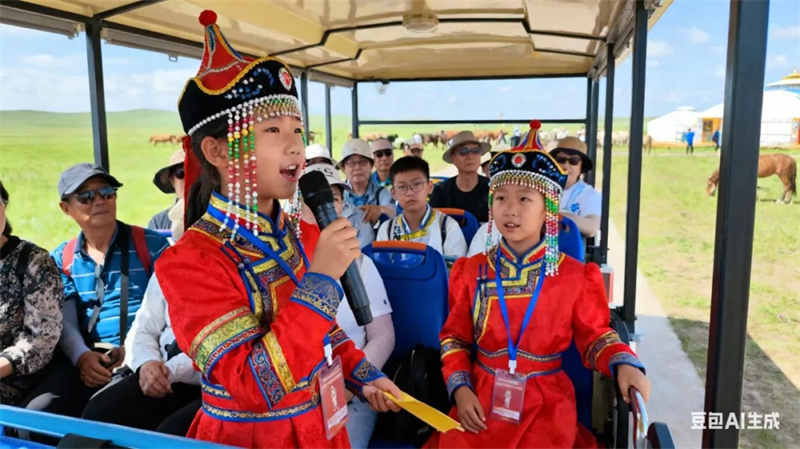 组织小讲解员5名,身着民族服装,登上观光车,为游客讲解陈巴尔虎旗历史、游牧文化、草原文化、草原故事,展示民族歌舞等,带游客观赏草原美景的同时,宣传北疆文化。