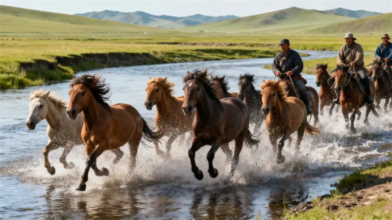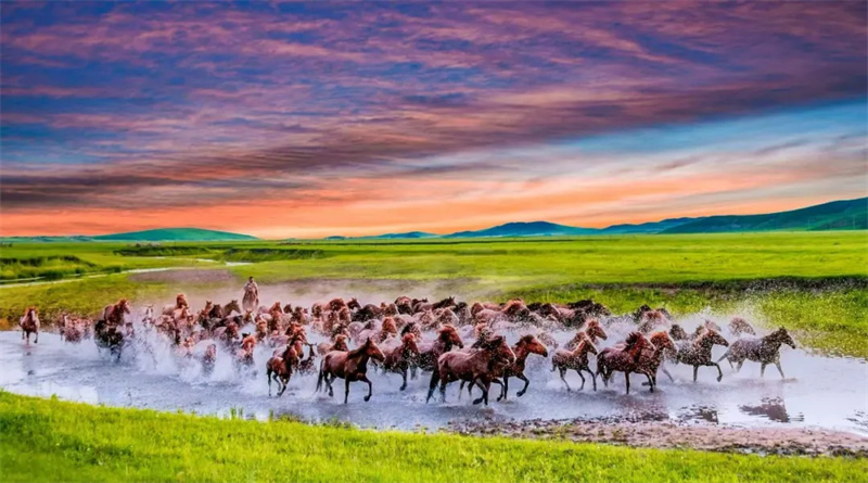 在莫尔格勒河畔设置摄影场景,几十匹马由骑手驱赶,跨河奔腾而过,游牧迁徙、马踏水花等场景,邀请游客及摄影爱好者参与拍摄。