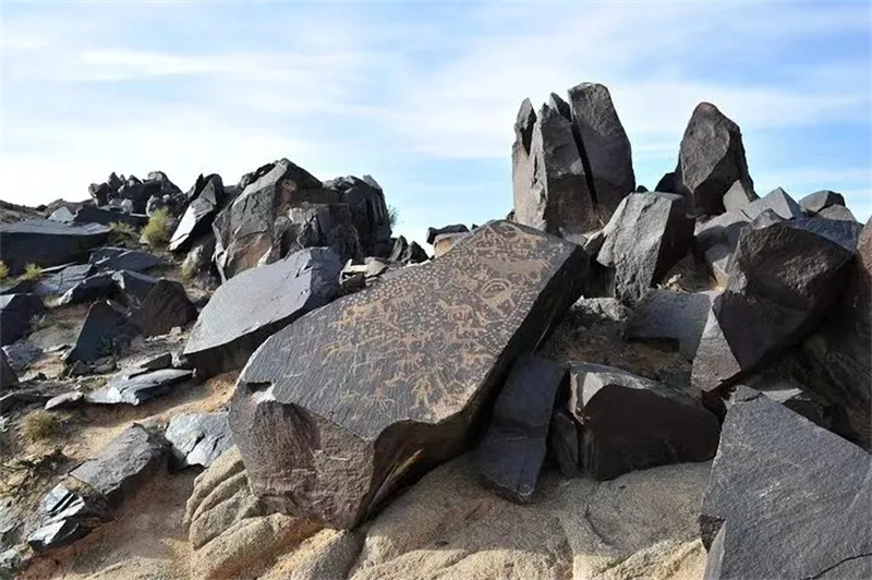 上午驱车前往阿拉善右旗,途中经过大漠天池、曼德拉山岩画景区(2A),大漠天池有世界罕见的沙漠堰塞淡水湖,还能看到石林、古人类遗址等景观。曼德拉山曾是多个北方少数民族的游牧地,岩画记录了他们的生活场景和文化符号,现有岩画4234幅。