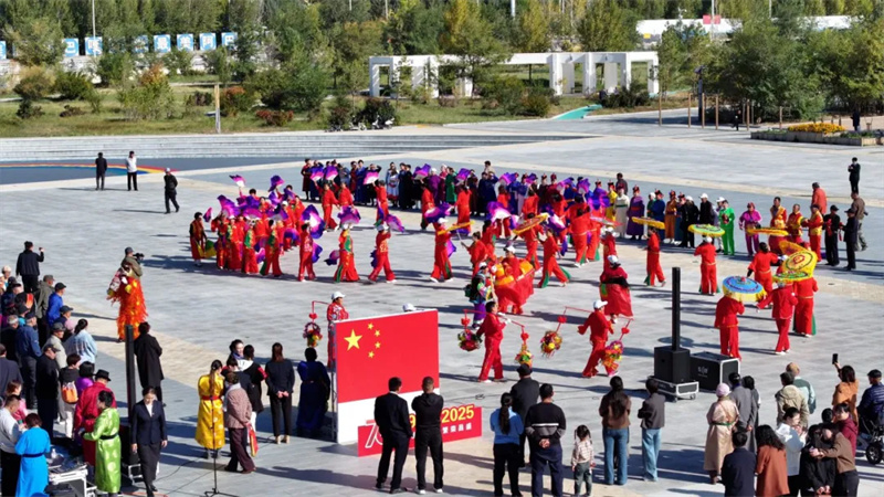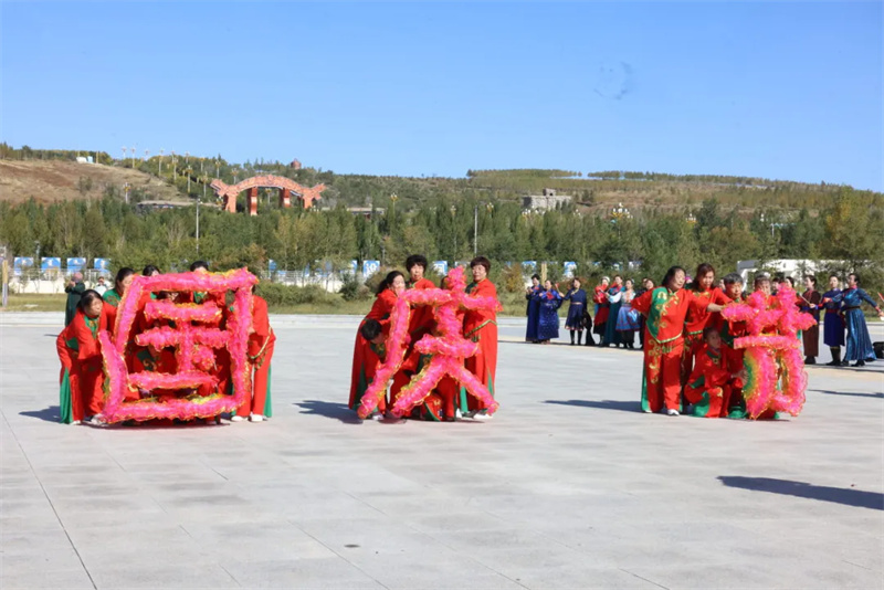 广场各处接连响起悠扬的歌声与欢快的舞步,乌兰牧骑、文化馆演员与群众文艺队伍共同上演“红歌快闪”。秧歌舞、广场舞、马头琴独奏、长调合唱等节目轮番登场,赢得阵阵掌声。最后,全场演员与群众齐声高唱《我和我的祖国》,手中挥舞的五星红旗与歌声交织在一起,把节日氛围推向高潮。