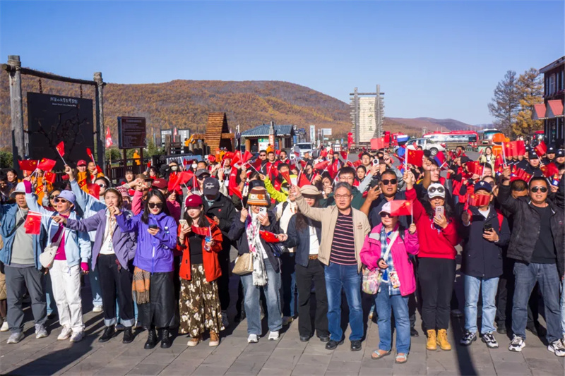 各地游客在阿尔山国家森林公园挥舞国旗(阿尔山市委宣传部供图)