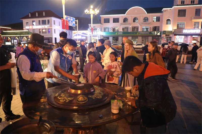 志愿者在街边热情服务为游客制作奶茶(阿尔山市委宣传部供图)