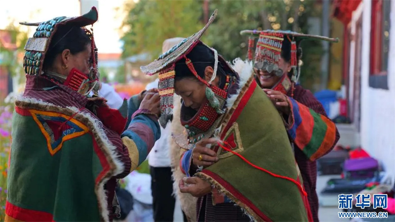 图为科迦村村民在互相帮忙穿戴普兰服饰(9月23日摄)。新华网 柑丹鸯琦摄