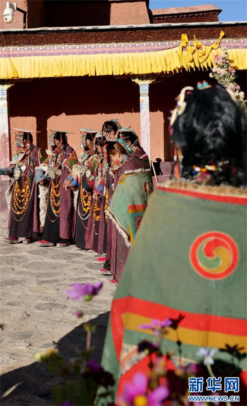 图为身穿普兰服饰的科迦村村民在表演宣舞(9月23日摄)。新华网 柑丹鸯琦摄