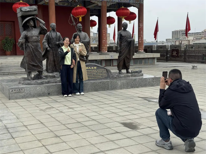 室内文化场所热度逐渐攀升。南城门楼里,“梦回乐舞凉州”——西凉乐舞演出正在上演。武威市五凉文化博物馆的演员们身着古装,舞步轻盈如蝶,彩带随旋律飘动,琵琶与鼓点交织出西凉乐舞的独特韵味。来自新疆的游客杨光辉女士举着相机连声赞叹:“就像是壁画里的人儿走出来了,这‘文化味’太足了!”武威文庙内,“中华民族大联欢”活动同样热闹,身着民族服饰的工作人员邀游客共舞,射箭、投壶等传统游戏区排起长队,让互动体验成为文旅“大餐”里的鲜活滋味。