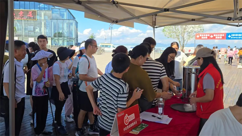 在游客排队区域,工作人员准备“奉上好品”小吃礼包,让等待时光也变得有滋有味。