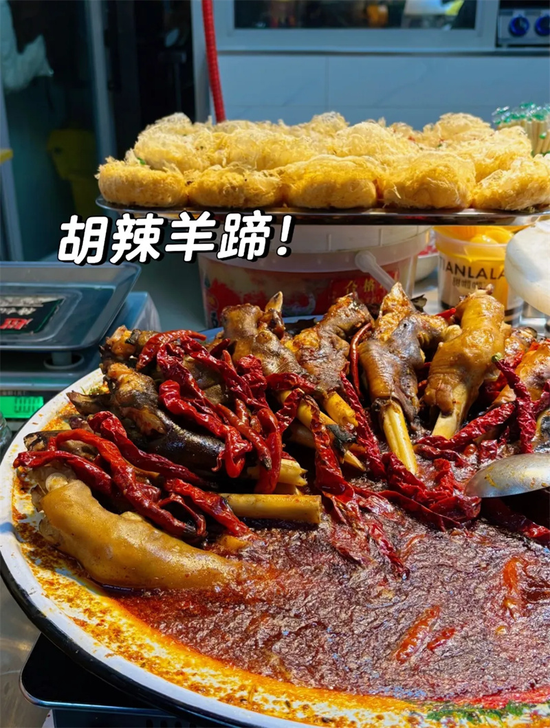 刚出锅的胡辣羊蹄绝对是硬核开胃菜,软糯的蹄筋裹着浓郁的胡辣酱汁,轻轻一抿就能脱骨,鲜辣中带着羊肉的醇厚,越啃越上头。