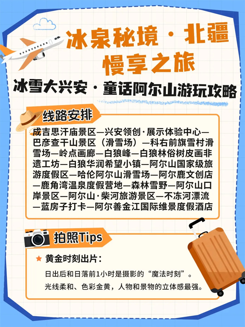 这趟兴安盟冬季之旅,有文化的厚度、自然的壮美、玩乐的刺激、养生的惬意~ 18个宝藏景点+超全实用贴士,不管是情侣出游、家庭度假还是朋友结伴,都能找到属于自己的快乐。别等啦,这个冬天,就来兴安盟赴一场“冰泉秘境・北疆慢享之旅”,把所有浪漫和欢乐都收入囊中!