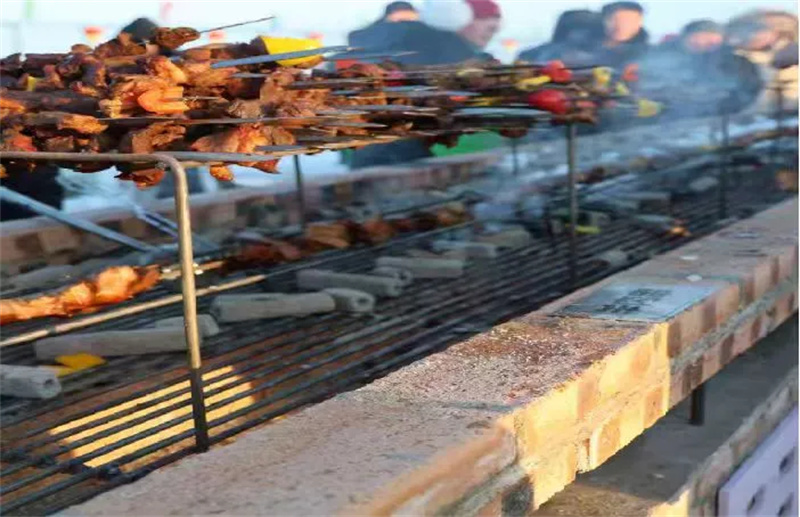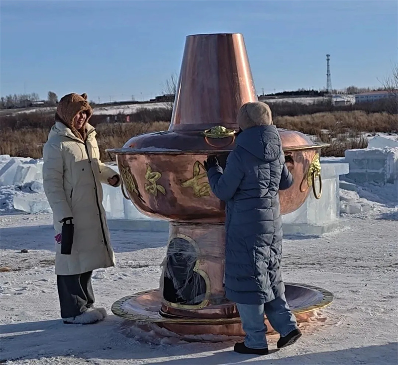 五口直径超1米的大锅炖煮“鱼羊鲜”,雪地热气腾腾的火锅,现烤10米大串、烤列巴、烤地瓜、红糖姜茶……暖胃又暖心。