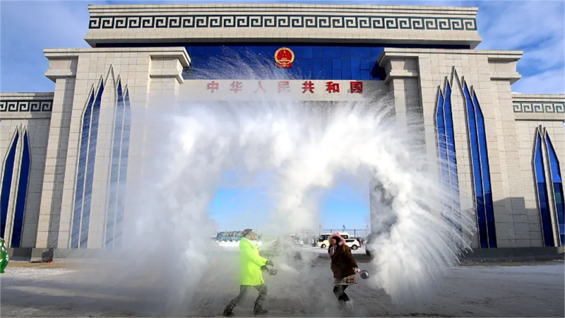参观界碑、体验冰雪娱乐项目,包括拖拉机拉雪圈、跨越瑞士卷、逃出冰坑、冰上独木桥、泼水成冰……