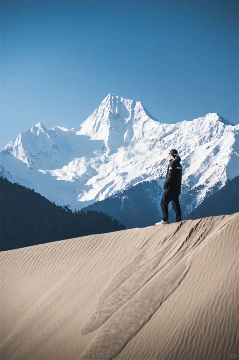 在这里,你会看到贡拉嘎布雪山、雅鲁藏布江和连绵起伏的金黄色沙丘相映成趣,美得不可方物。